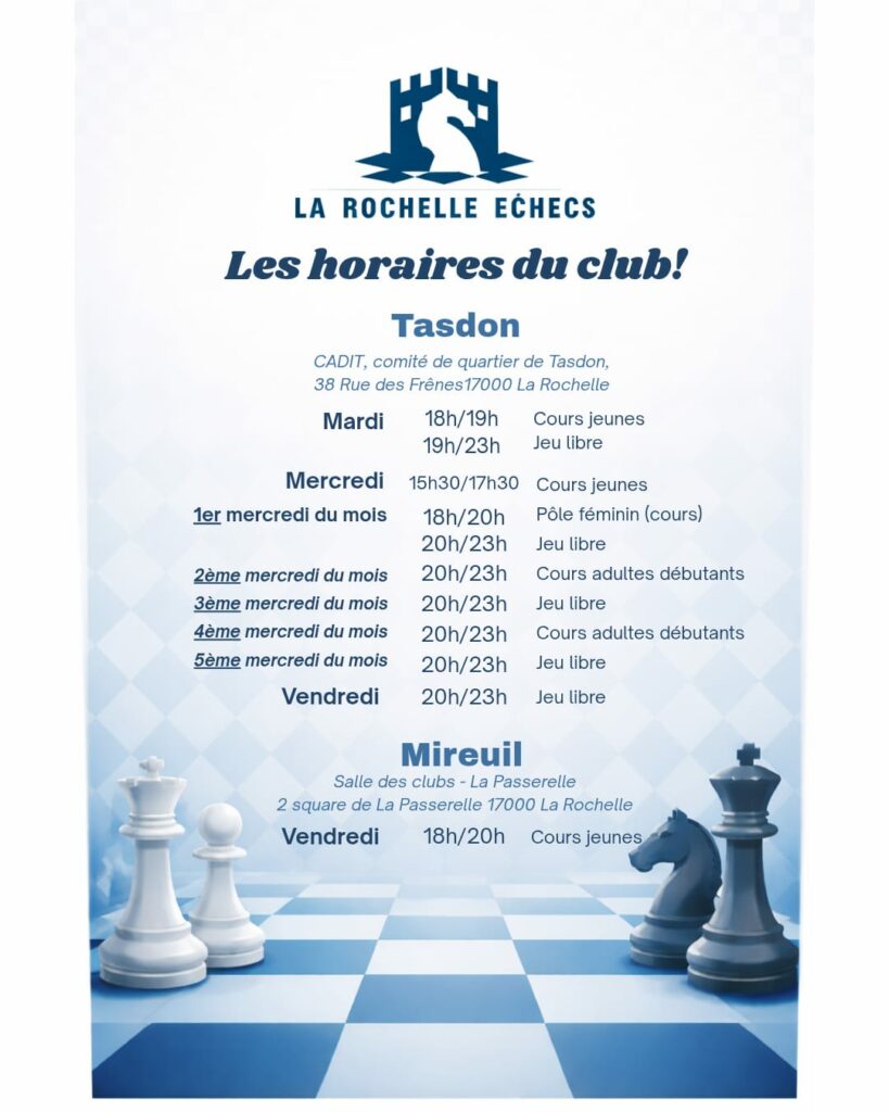 - La possibilité de découvrir/jouer en compétition officielle (Nationale 4, Régionale 1 ou 2, Open et rapides)
